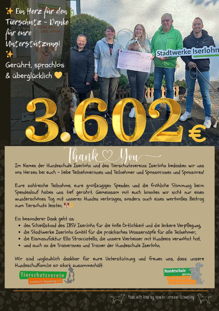 Da alle Aktiven der Hundeschule ehrenamtlich tätig sind, fließt der gesamte Erlös dem Tierschutzverein Iserlohn und Umgebung e. V. und somit dem Tierheim Iserlohn zu.